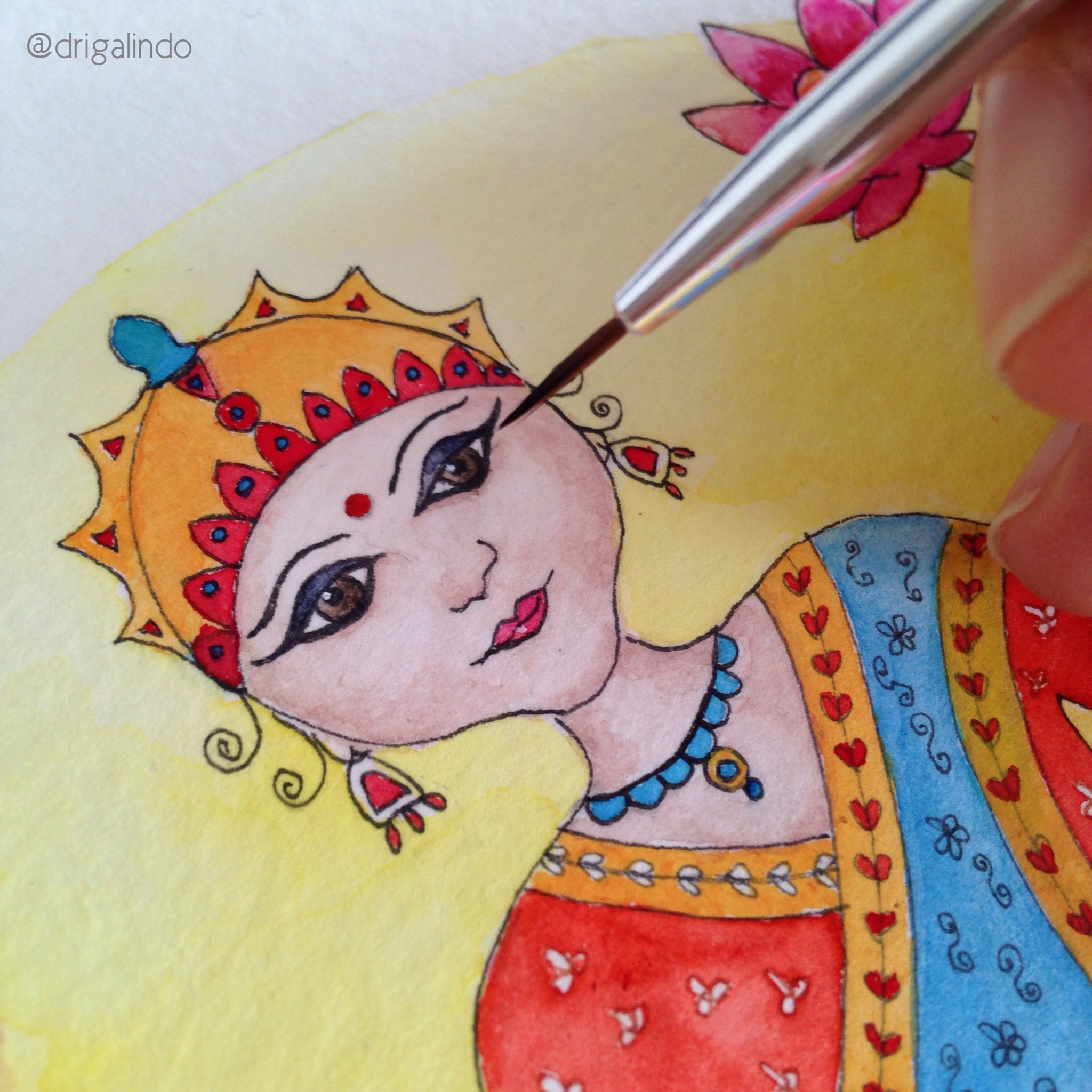 Pequenos detalhes Imagem | 24 de outubro de 2014 | drigalindo Esta é a segunda aquarela de Lakshmi que faço. É um trabalho cheio de detalhes e enquanto pinto, minha mente acalma como numa meditação. Que Lakshmi traga a tranquilidade que tanto precisamos! Namaste!