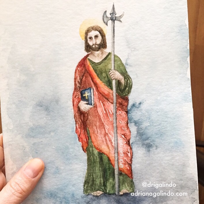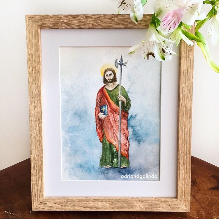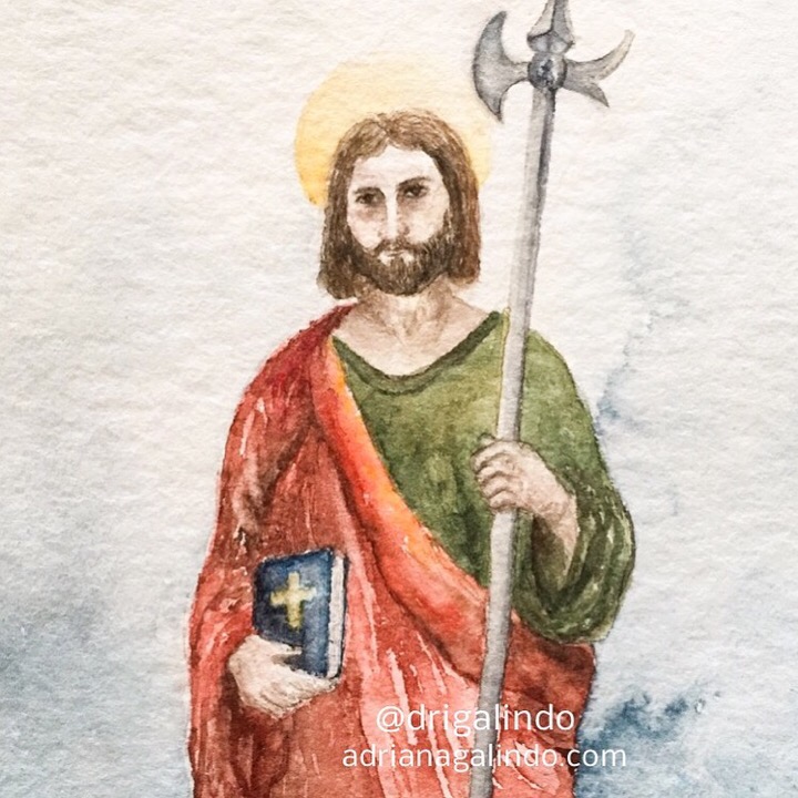 Recebi o pedido de pintar o santo São Judas Tadeu, e sempre que recebo uma encomenda, eu faço uma pesquisa, recolhendo imagens e informações sobre o tema. Estou muito honrada em pintar este santo que reúne tantos devotos. Com certeza foi um abençoado desafio ❤️