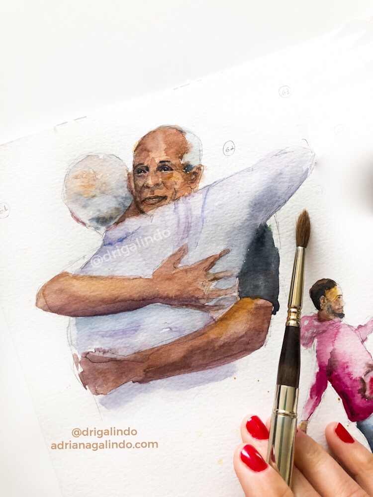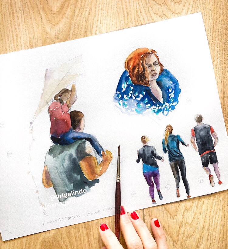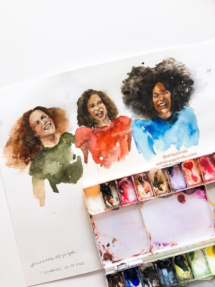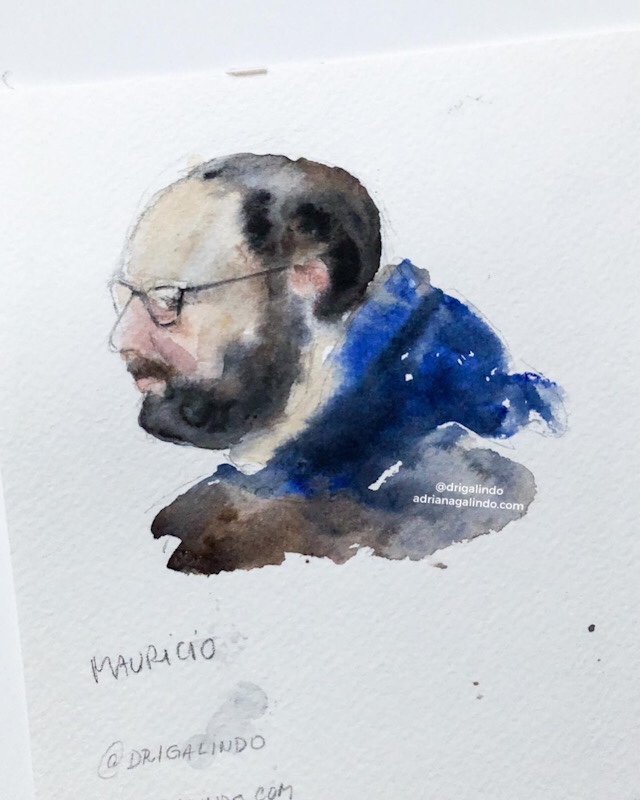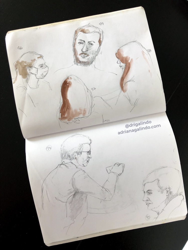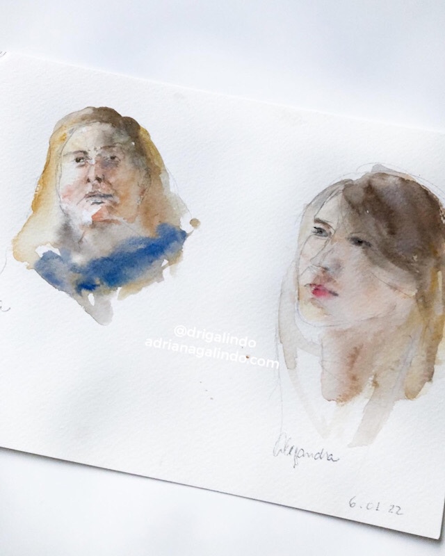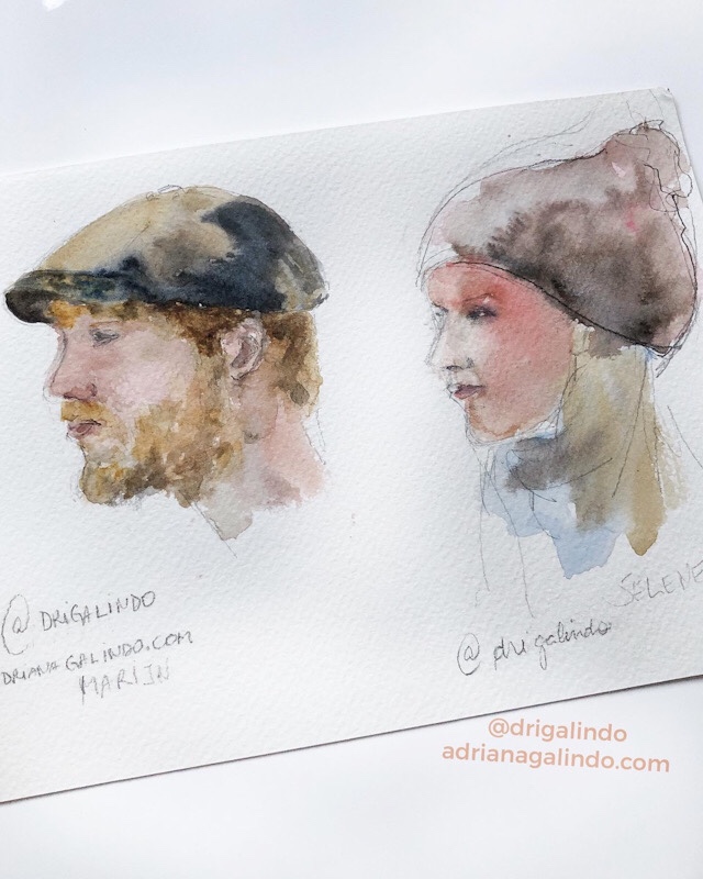 Então, nesses 5 dias intensos, produzi aquarelas a partir de fotografias e desenhos a grafite de pessoas ao vivo.