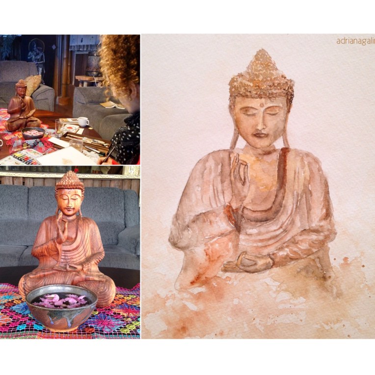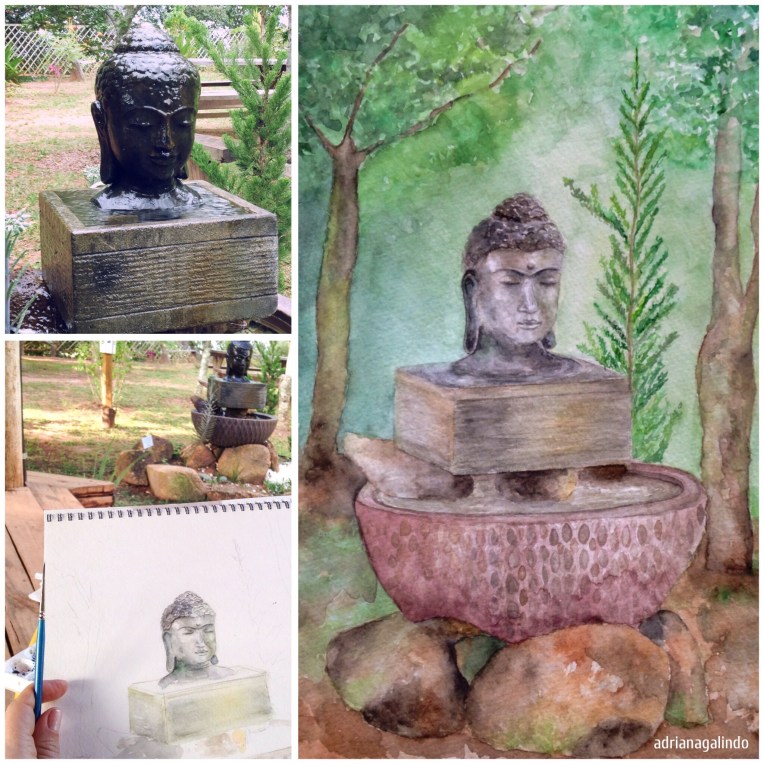 Mais um trabalho realizado em Cunha/SP, no Espaço Flor das Águas. Este Buda é uma fonte que, tanto a imagem quanto o som da água, me fez meditar enquanto pintava. Me senti leve e concentrada, vazia e preenchida…me senti abençoada.   Aquarela, 22,9 x 30,5 cm