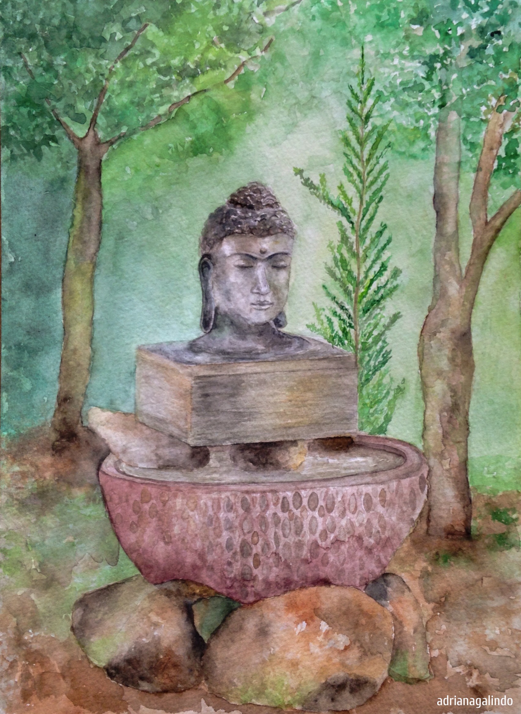 Mais um trabalho realizado em Cunha/SP, no Espaço Flor das Águas. Este Buda é uma fonte que, tanto a imagem quanto o som da água, me fez meditar enquanto pintava. Me senti leve e concentrada, vazia e preenchida…me senti abençoada. Aquarela, 22,9 x 30,5 cm